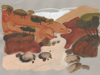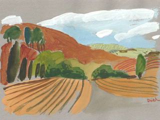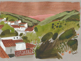 This series captures the warm, sunlit calm of autumn in Riogordo, a season when the hills turn copper, the olive trees grow heavy, and the village glows with soft afternoon light. Painted with acrylic on toned paper and accented with colored marker, these works blend loose expressive shapes with clean, deliberate lines.