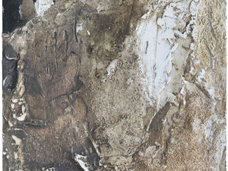 I gathered anything that could hold a trace: bits of fabric, torn cardboard, grains, dried grasses, the dust of old streets. Sometimes it felt as if I was collecting fragments of someone’s days rather than materials. The layers settled slowly, like winter snow on stone roofs. I pressed, scraped, added, removed, and beneath the white appeared warm sand, beneath the sand the shadow of charcoal, beneath the charcoal another forgotten tale.